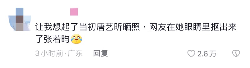 對此,網友熱評表示:「讓我想起了當初唐藝昕曬照,網友在她眼睛裡摳出來了張若昀👇」