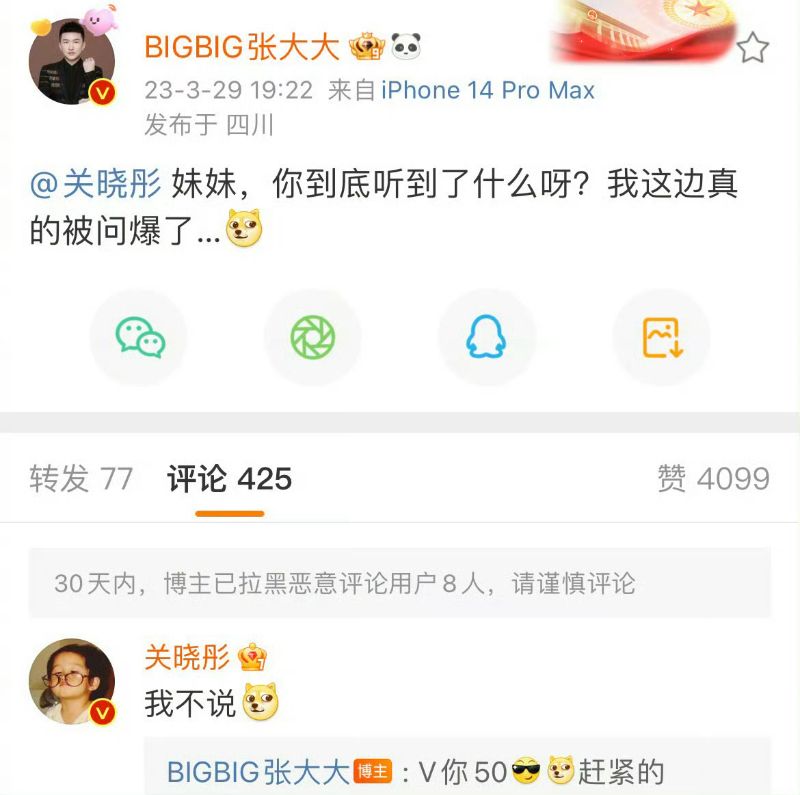 沒想到隨後張大大就發文,直接艾特了關曉彤,配文:「妹妹,你到底聽到了什麼呀?我這邊真的被問曝了…」是噠,都知道張大大近來成為了不少網友的“娛樂圈人脈”,很多網友直接在他直播間許願、問八卦,可以回答的他都回答!這一次,輪到了關曉彤被點名啦!而關曉彤也很快回復,高傲表示:「我不說」哈哈哈哈哈哈哈哈哈哈哈哈哈哈哈哈哈哈哈哈哈,果然很有吃瓜精神啊!!!!!而張大大立馬回復:「V你(微信你)50,趕緊的!」👇