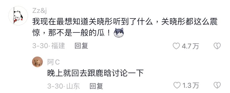 當時照片公開之後,就有不少網友在線好奇,想知道究竟關曉彤聽到了什麼瓜,更有人搞笑表示,鹿晗一定知道~
