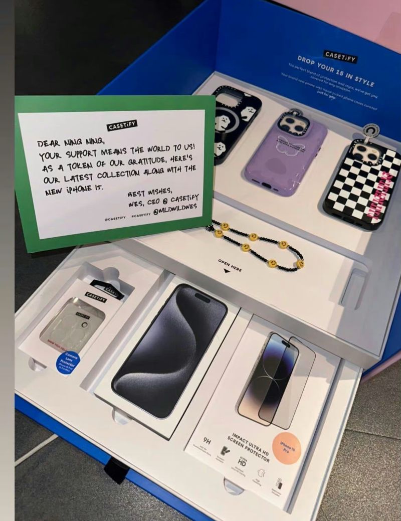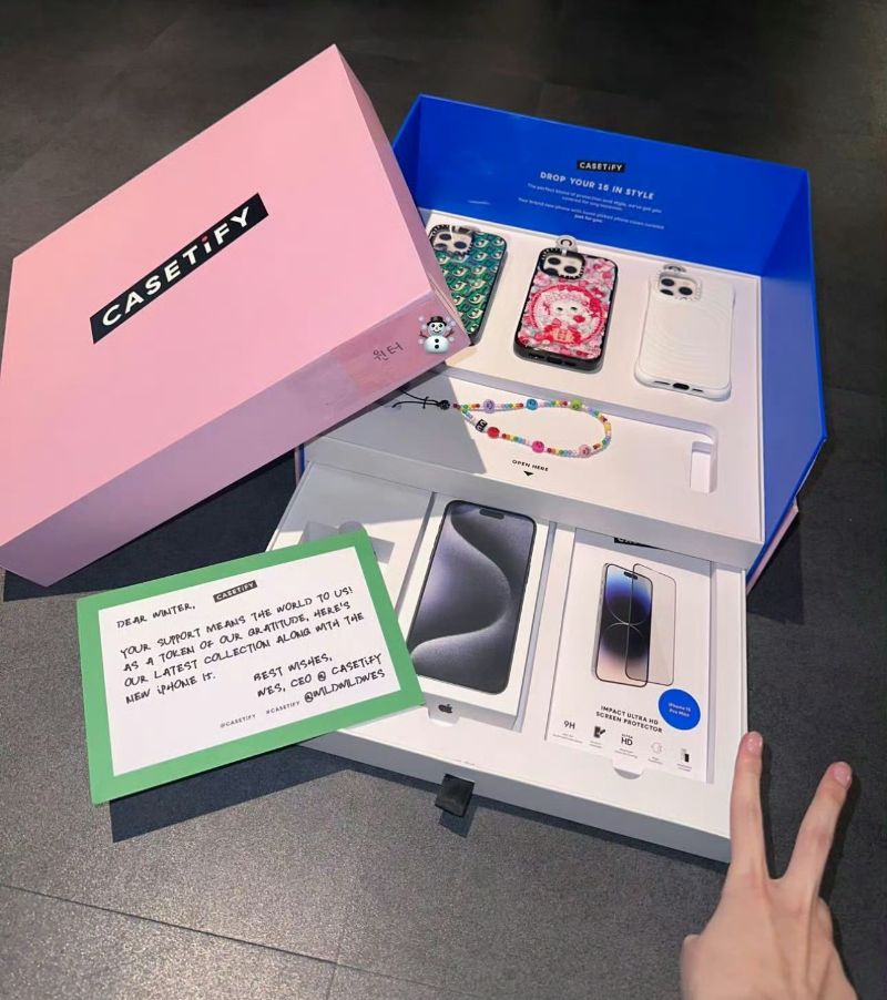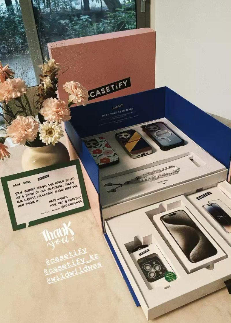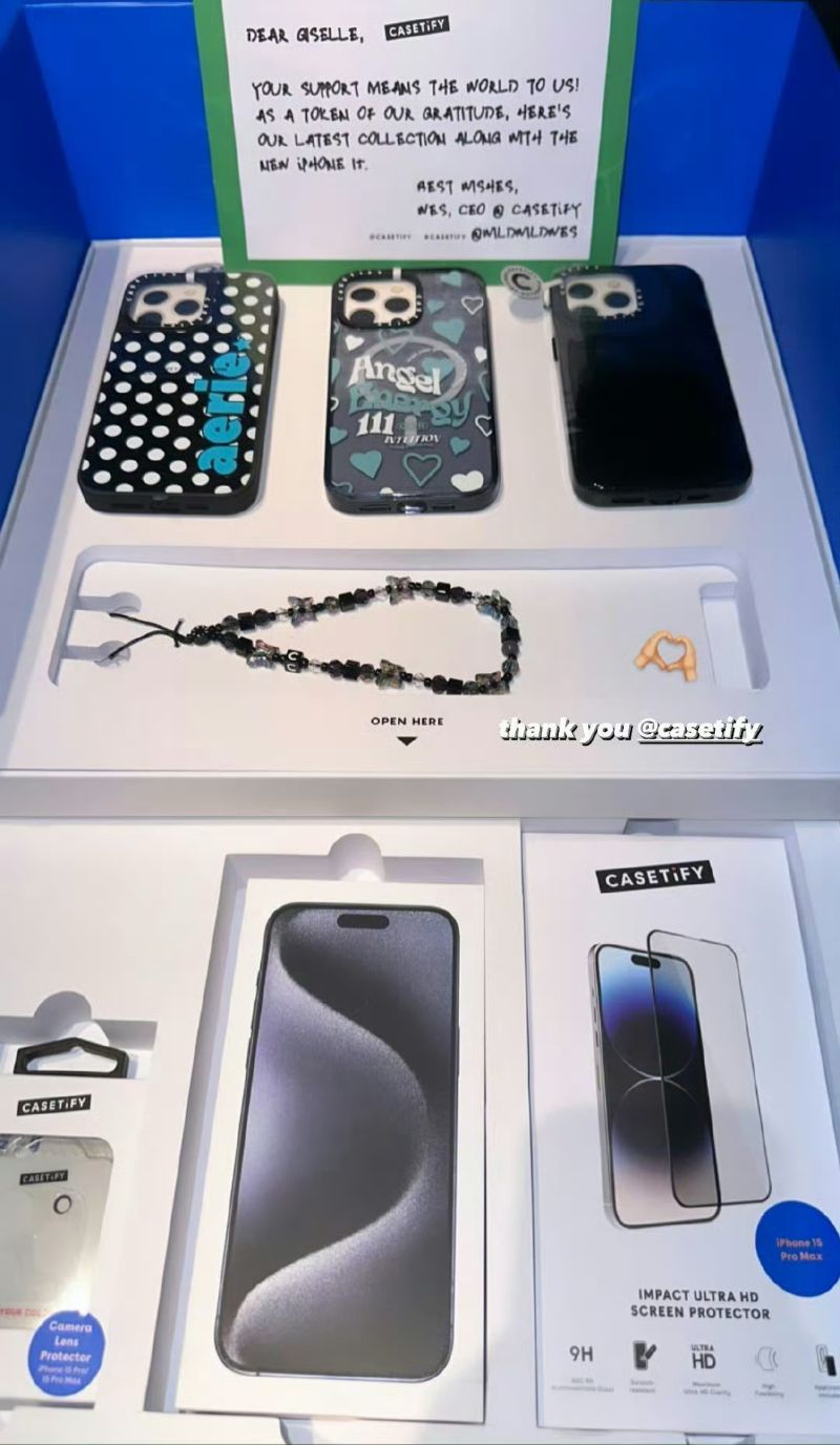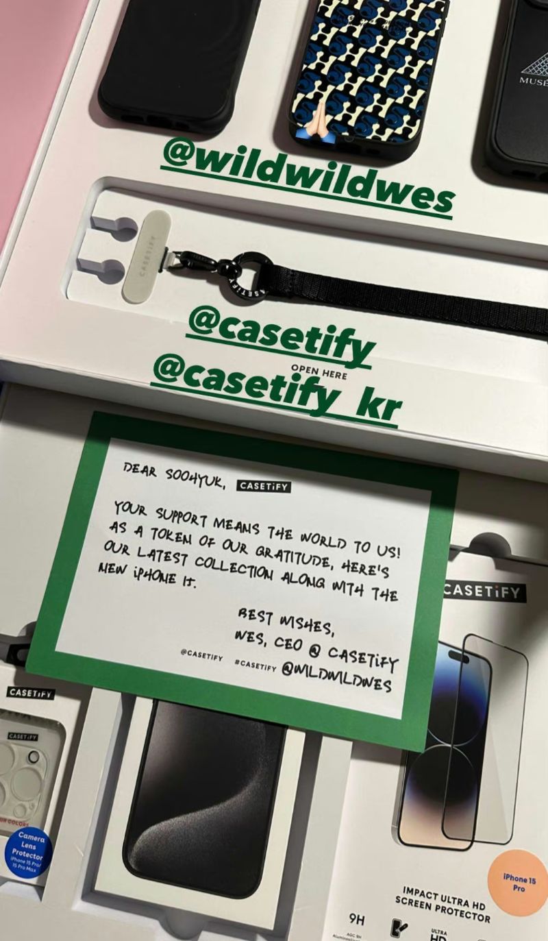 近日,智秀更新INS限時動態時,曬出了自己收到的Casetify手機禮盒,裡面不但附上了三個最新設計的手機殼,手機鏈,重點看起來…就連iPhone 15 Pro都一併送上,這…未免也太貼心了吧!!!