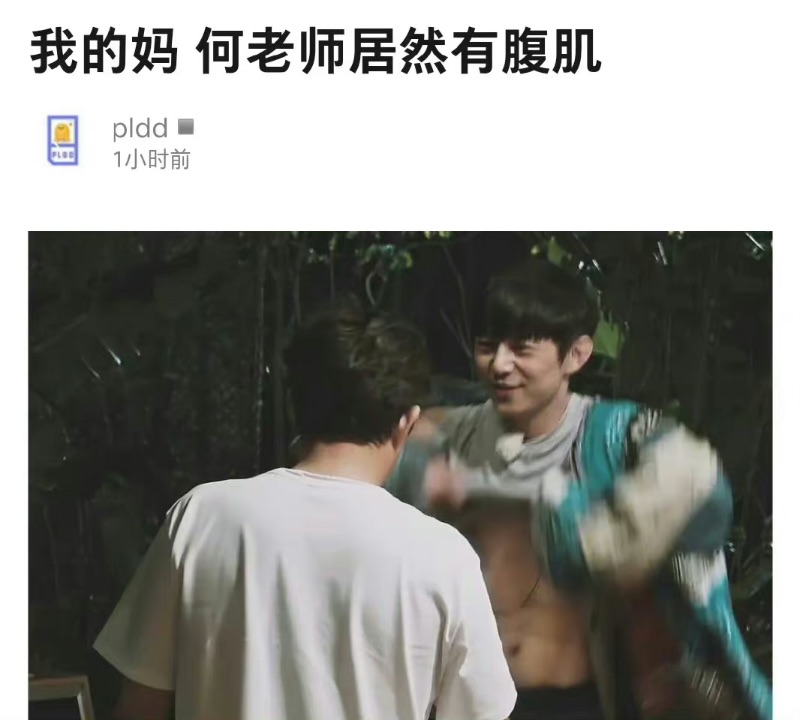 在這張照片引發熱議之後,網友紛紛扒出之前何老師曾露過肌肉的照片,包括了這張在節目中露腹肌的經典時刻👇🏻