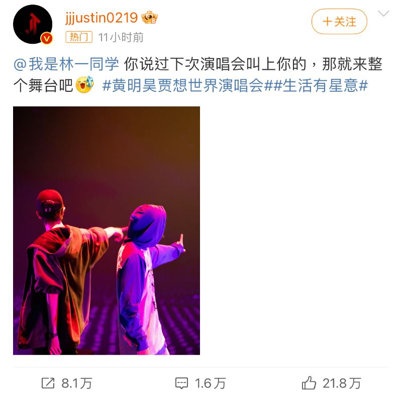 啊啊啊啊啊啊~這還真是夢幻聯動啊!!!是噠,黃明昊「賈想世界」演唱會秋季場在22號這天,于中國長沙舉辦,當中最出圈的表演,就是…林一來啦!