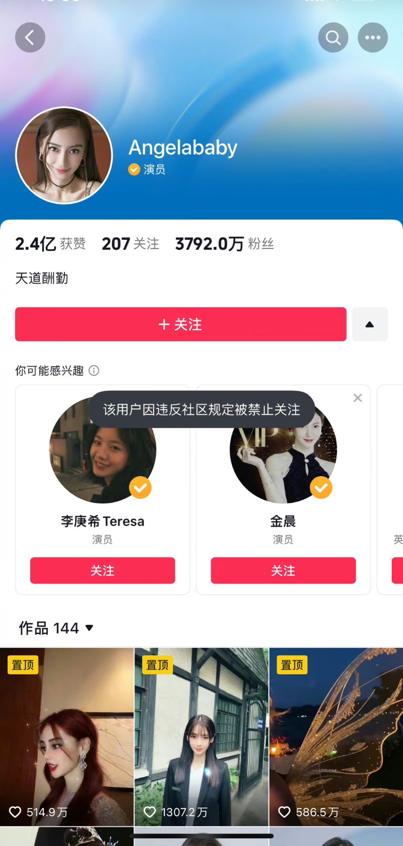 兩人的抖音帳號也處於無法關注的狀態,顯示「違反社區規定而無法關注」👇🏻