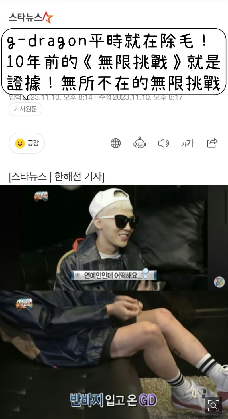 警方聲明之後,韓網就有不少反駁的言論,當中就連10年前的《無限挑戰》都成為了證據?沒錯,有媒體找出了G-Dragon在10年前參加《無限挑戰》錄製時的照片,當時就可以看見他沒有腿毛,一如他所說的,因為身為藝人,所以平時都有在做毛髮管理👇