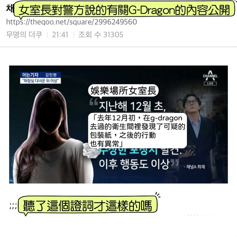 而在10號晚上,又傳出了有關警方證人,也就是身為李善均情人的娛樂場所女室長,針對G-Dragon部分的供詞,那就是:「去年12月初,在g-dragon去過的衛生間裡發現了可疑的包裝紙,之後的行動也有異常。」這段話立刻在韓網引起熱議,韓網友對於警方居然僅以這樣的供詞,就對權志龍展開調查表示…無語!