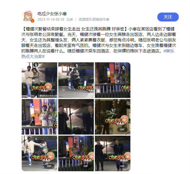 該狗仔爆料表示拍到了檀健次與張萌老公聚餐,結束後摟著女生出門。來看看畫面中,檀健次摟著一位女生肩膀走出飯店,兩人邊走邊聊天👇
