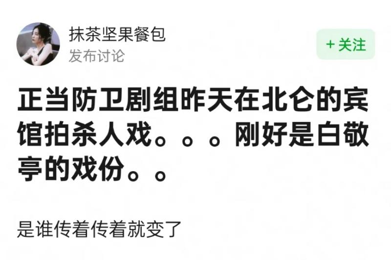 於是網友們再重新整理瓜源,才發現這瓜一開始說的是白敬亭劇組《正當防衛》在北侖賓館拍殺人戲,剛好是白敬亭戲份,怎麼傳著傳著就變了?