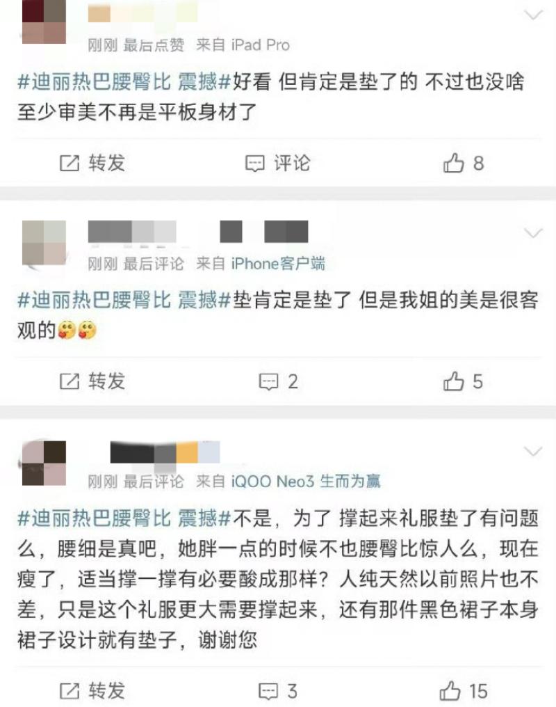 還有網友發帖,曬出迪麗熱巴另一個造型的背影,表示今晚也墊太多了!
