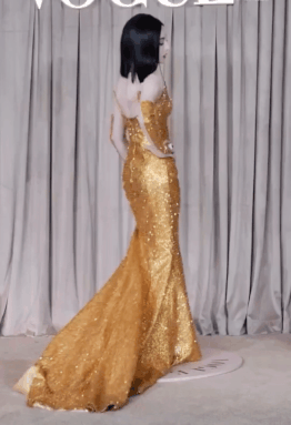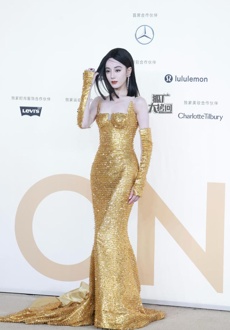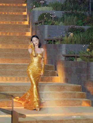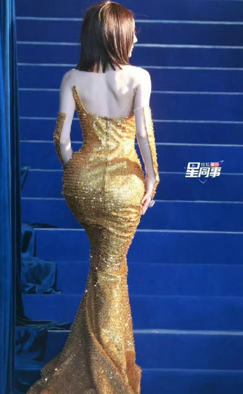 身穿GUO PEI 2017秋冬高級定制系列的熱巴,選擇了金色抹胸裙華麗登場,精致高定搭配直切髮型超亮眼!