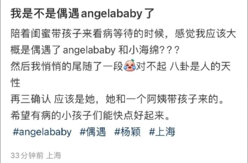 沒想到24號凌晨,有網友發文表示自己在醫院偶遇Angelababy帶著小海綿來看病,掛的是急診👇