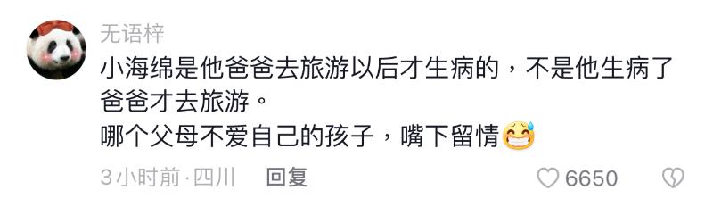 不過也有網友解釋,表示小海綿是爸爸去旅遊後才生病的,希望網友們嘴下留情。