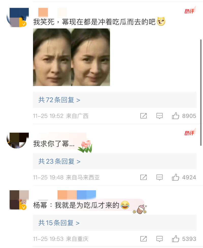 到底我們大冪冪又怎麼了?你沒猜錯,我們大冪冪又成為了「吃瓜大戶」,再次以吃瓜表情包出圈啦!是噠,如果你有關注之前的《微博之夜》的話,就會知道大冪冪當晚也爆了熱搜榜,原因是…全網都好奇,到底楊冪聽見了什麼?這就把當晚表情包送上,也就是俗稱的「吃瓜表情包1.0」👇