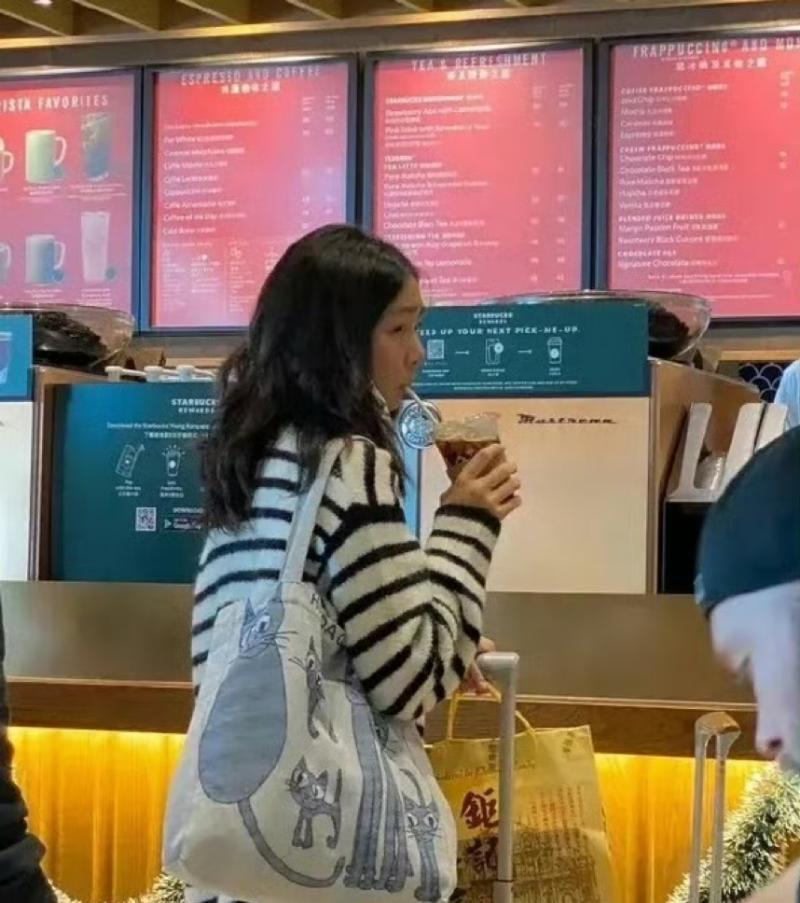 網友拍到黃多多不但沒有在貴賓室,而是出現在星巴克自在的喝著飲料,不但素顏,身上也只背著看起來很普通的大包,而她穿的條紋毛衣被網友扒出人民幣1990塊,與李湘女兒Angela相比,她的穿搭還是比較低調的。