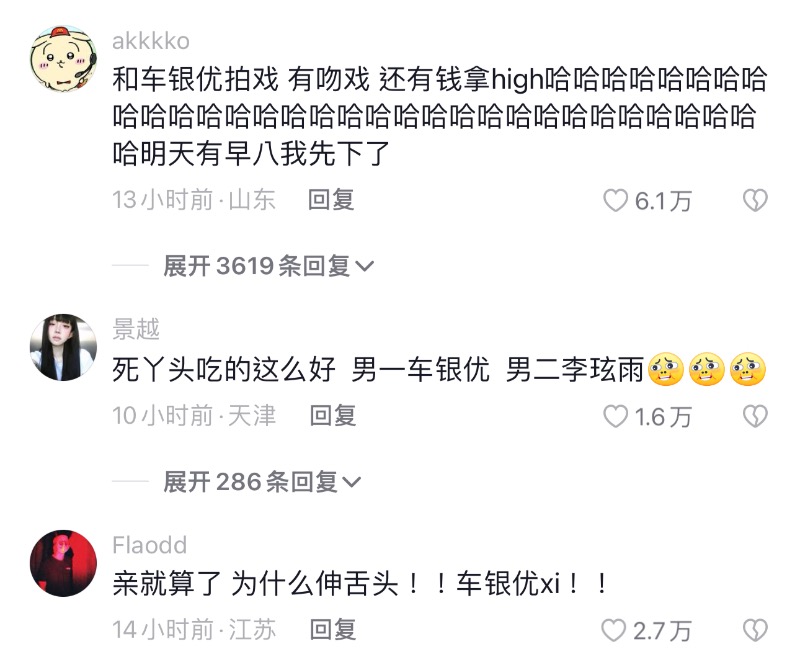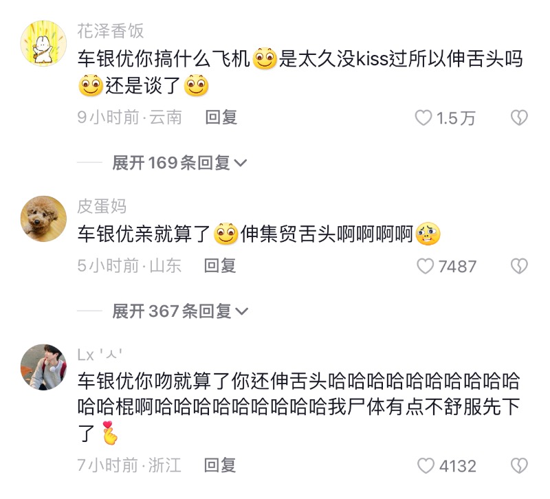 「太搞笑了!要把車銀優的接吻熱帖分類為「有用 科普 推薦」板塊哈哈哈哈!」
