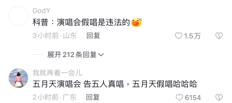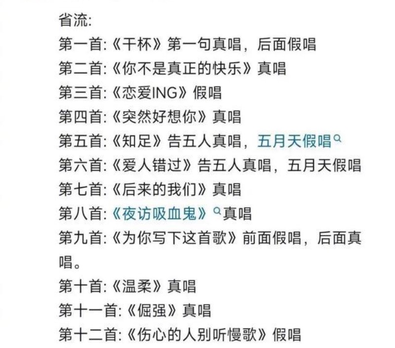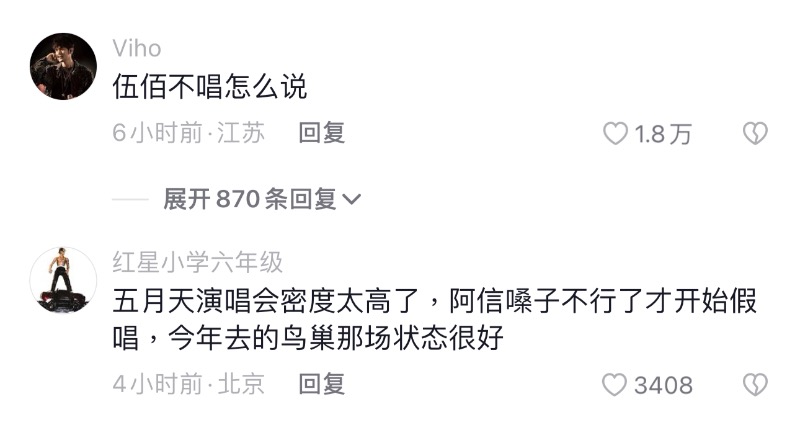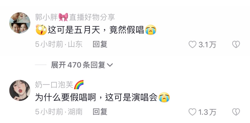 一開始還有不少粉絲在玩梗,甚至曬了阿信破音和跑調的“車禍現場”視頻,想說明假唱實屬誤判。但,絕大多數網友認為五月天不會假唱,認為這兩位博主就是蹭熱度。