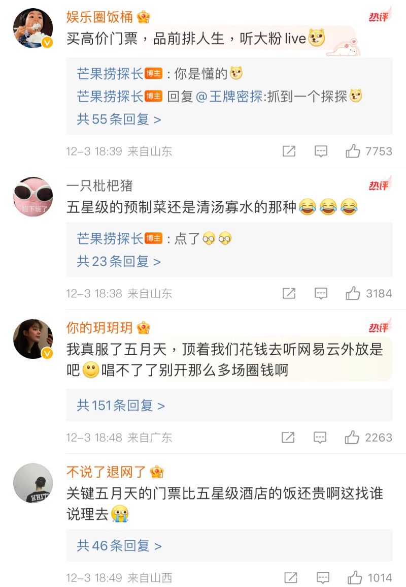 對於花高價去聽五月天唱現場的人來說,這感覺就像被欺騙一樣,於是「頂級樂隊假唱,五星級酒店預製菜」上了高位熱搜,網友認為兩者一樣荒謬!