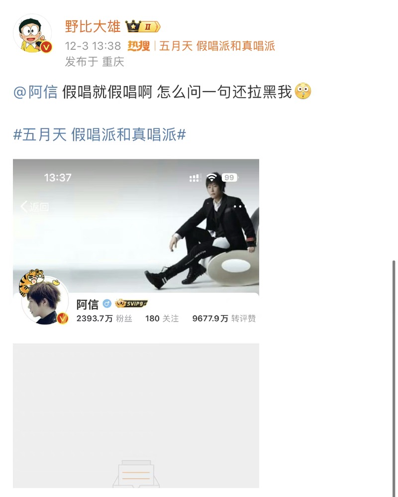 甚至還有博主表示,因為自己轉了一則有關阿信假唱的微博,結果被阿信拉黑?