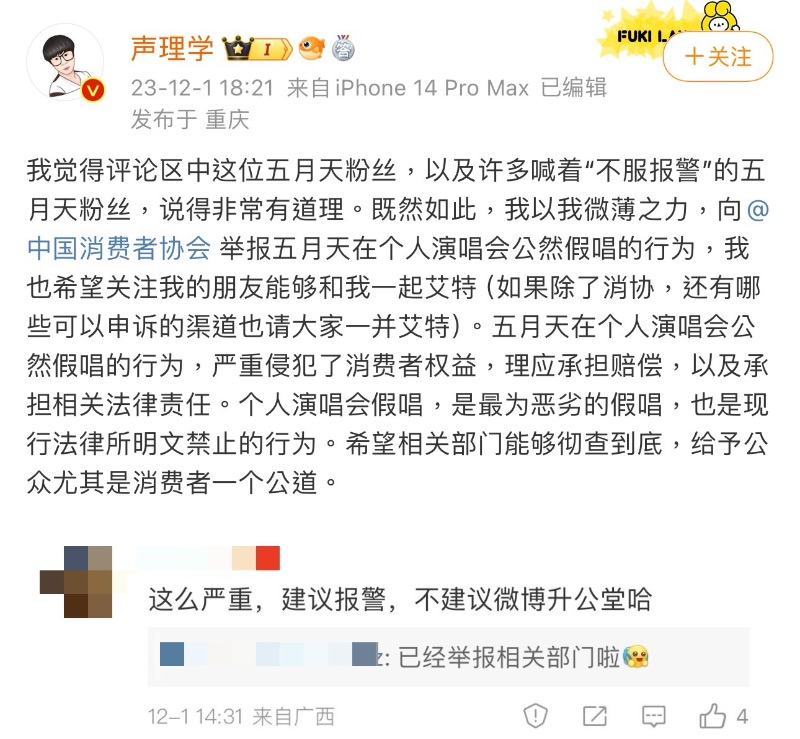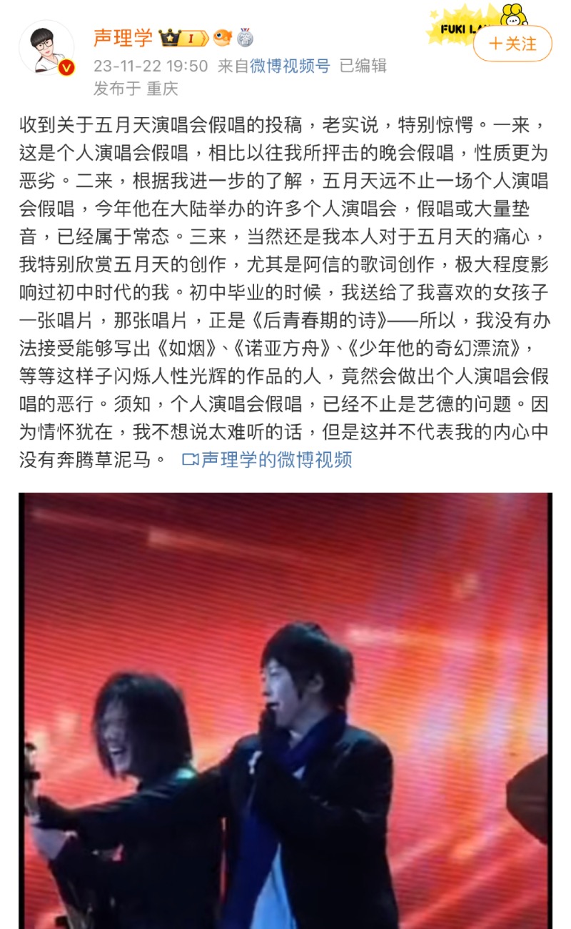 近期一開始發了有關五月天假唱討論的,是一位叫「聲理學」的博主,當時他在11月22號分享投稿內容,認為五月天假唱不應該,不過這條內容在當時沒有造成太大的輿論影響。