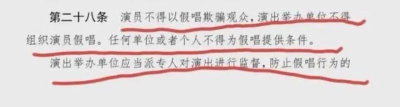 在中國,早有明文規定禁止商演假唱。 《營業性演出管理條例》第二十八條就規定,演員不得以假唱欺騙觀眾,演出舉辦單位不得組織演員假唱。任何單位或個人不得為假唱提供條件。若有假唱欺騙觀眾的,可由縣級人民政府文化主管部門處5萬元以上10萬元以下的罰款,為演員假唱提供條件的,則由縣級人民政府文化主管部門處5000元以上1萬元以下的罰款。