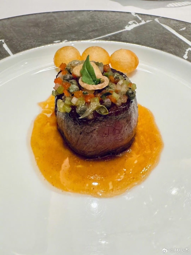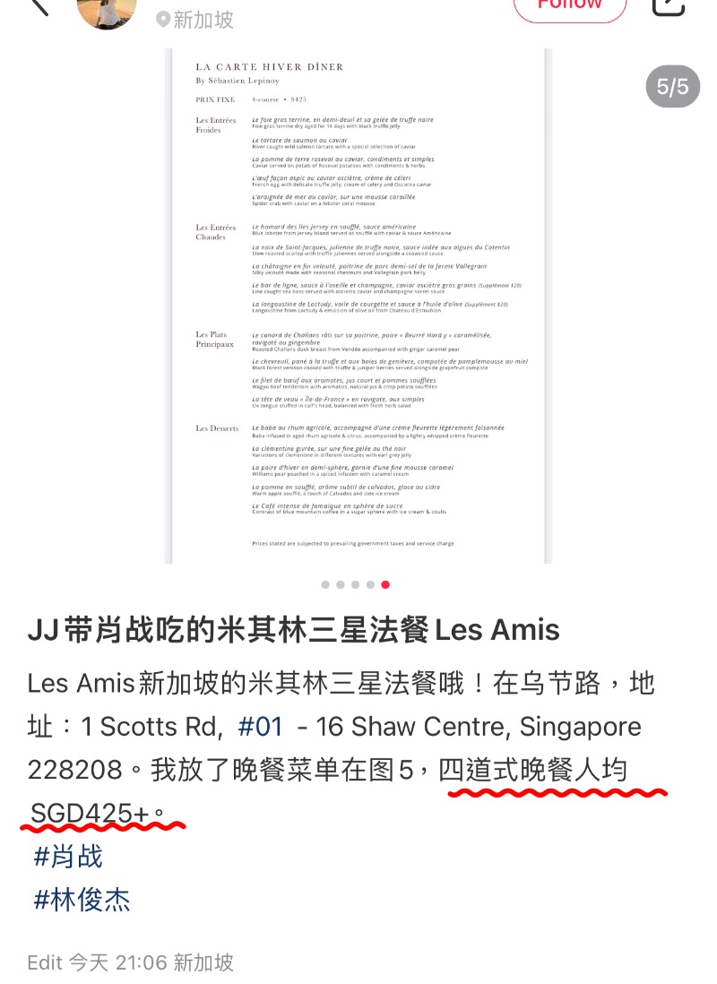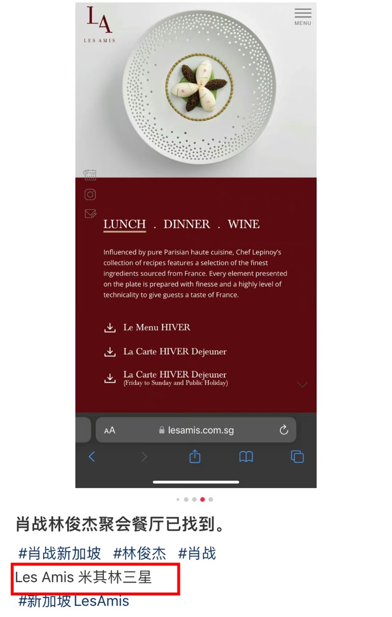 就憑這些美食,網友迅速扒出,兩人是在新加坡著名的米其林三星法國餐廳聚餐👇🏻
