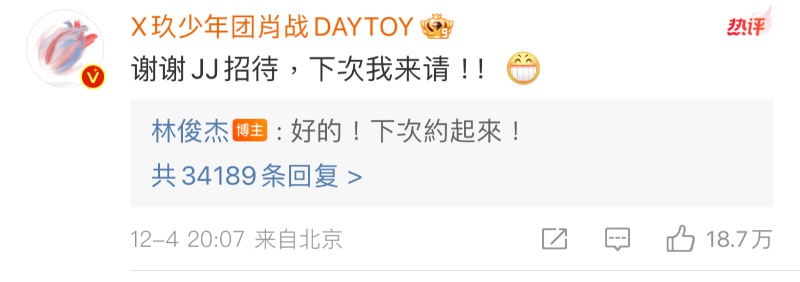 而肖戰也在評論區謝謝JJ的款待,更表示下次由他請客!