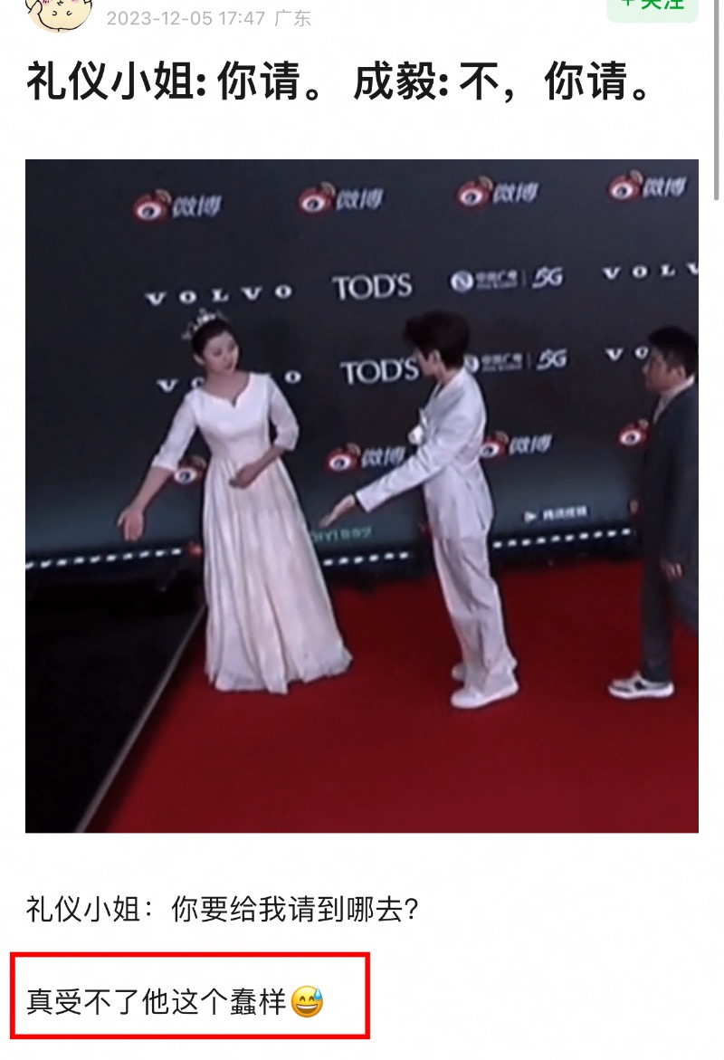 但,與此同時也有網友發帖吐槽,表示受不了成毅裝呆,走過紅毯的人怎麼可能和禮儀小姐互請,是要讓對方怎麼反應?