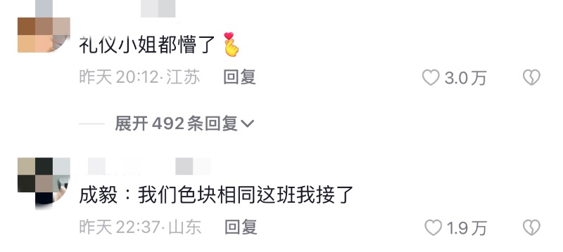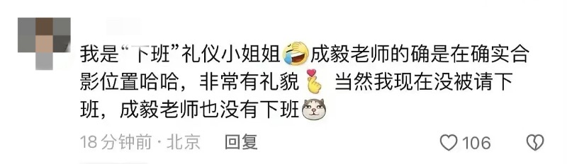 雖然但是,在引起熱議之後,該禮儀小姐留言回應,表示當時的真實情況,是成毅向自己確認拍照的站位,而不是讓自己下班啦!