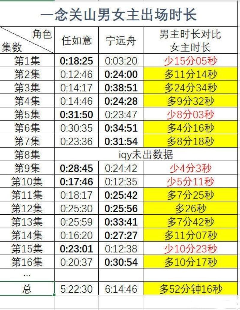 到底怎麼一回事呢?原來有粉絲拉了《一念關山》的男女主出場時長,發現有多集都是劉宇寧戲份比劉詩詩還多👇