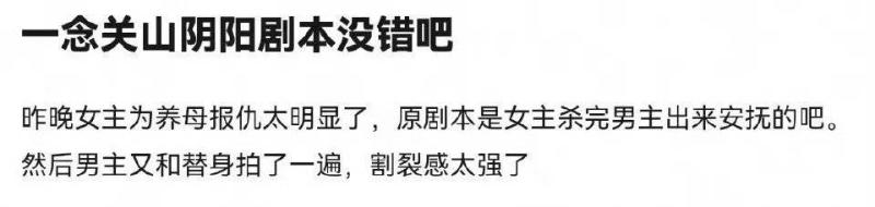 而在最新一集播出之後,有網友發帖表示《一念關山》是陰陽劇本,在女主為養母報仇這段劇情,原劇本是女主殺完之後男主才現身,但正片播出之後,變成了男主和替身拍攝的版本,就是男主出來救了女主!兩人同框時,女主完全沒有正面鏡頭👇
