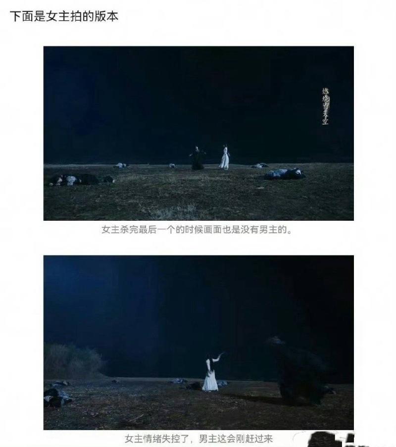 而網友扒出女主拍攝的版本,當女主殺完最後一個敵人時,畫面中是沒有男主的,一直到女主情緒失控之後,男主才趕來👇