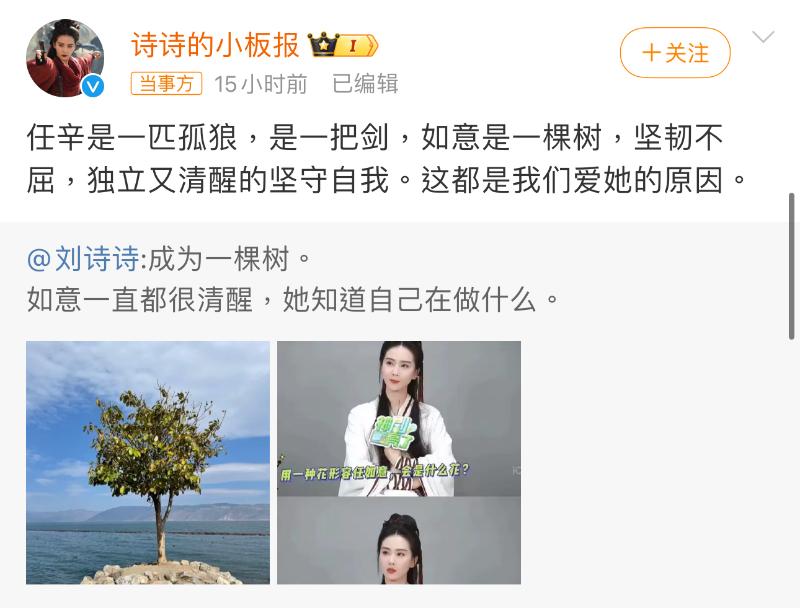 隨後,再度編輯微博,變成了「成為一棵樹。如意一直都很清醒,她知道自己在做什麼。」