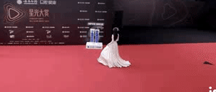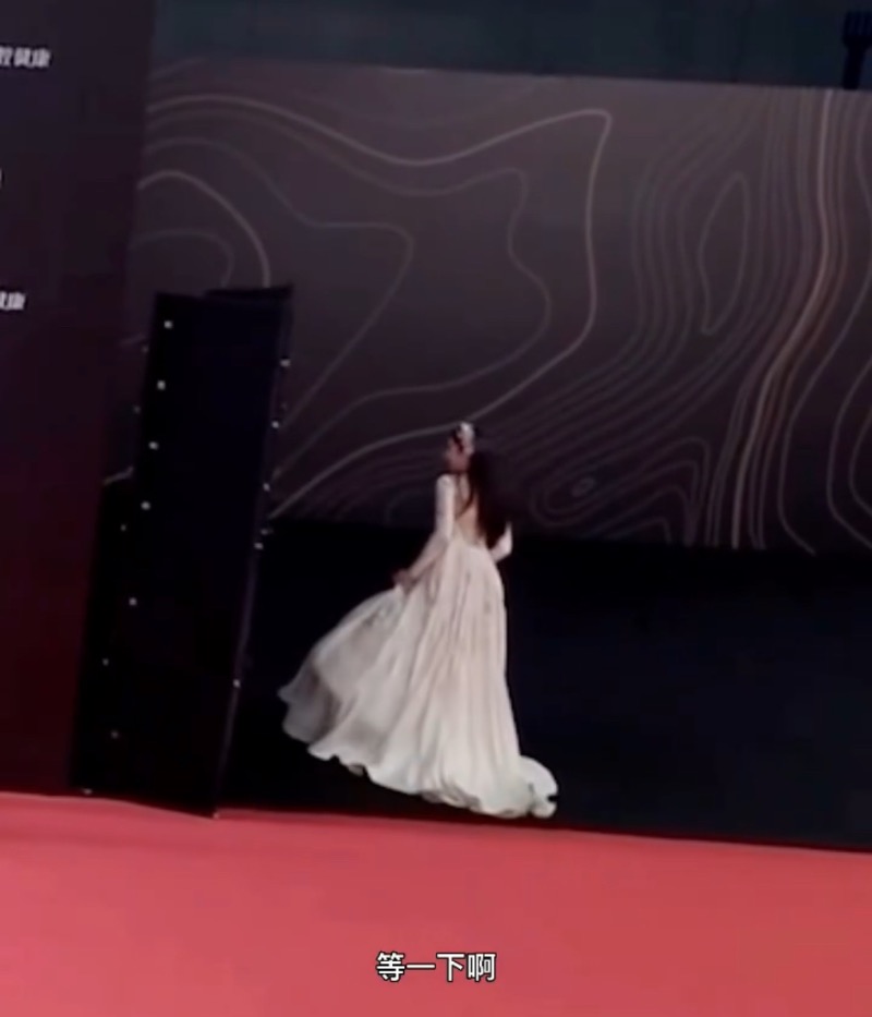 來看動圖,主持人已經在前方示意等待,但熱巴突然迷路一樣往背景板後面走去👇
