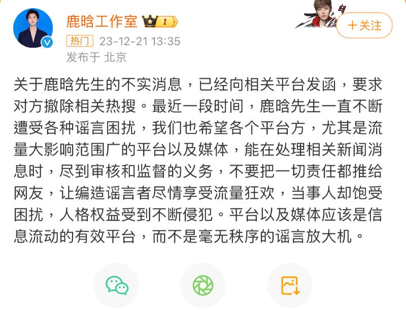 隨著熱搜,百度娛樂得到鹿晗工作室回應,表示領證為不實消息。而工作室隨後也發長文,表示這些都是謠傳,希望平台和媒體在處理相關新聞和消息時,盡到審核和監督的義務,不要把一切責任都推給網友,讓編造謠言者盡情享受流量,當事人卻飽受困擾!最後重申:「平台以及媒體應該是信息流動的有效平台,而不是毫無次序的謠言放大機。」