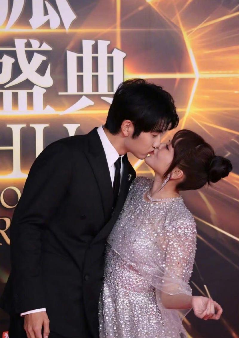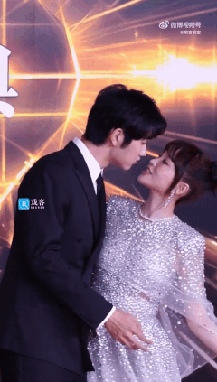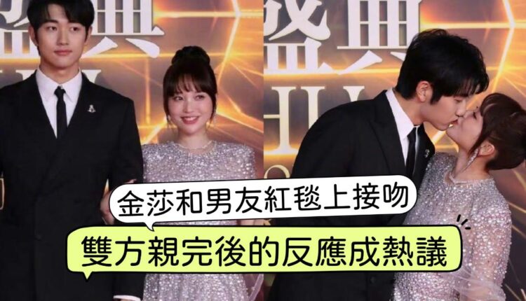 在拍照環節時,媒體要求摆出情侶pose,兩人直接就在紅毯上…接吻了👇