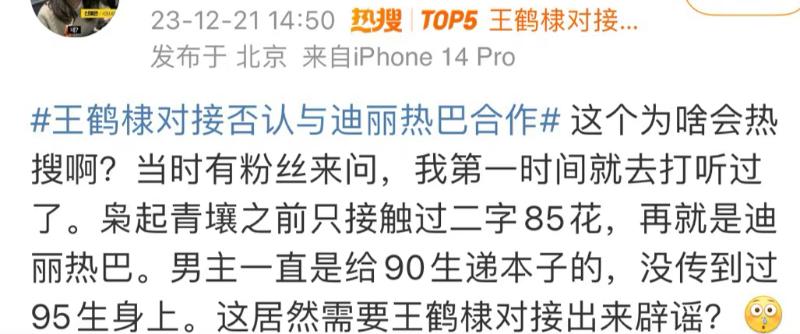 隨後,王鶴棣粉絲對接發文闢謠,表示王鶴棣拒演,直接上了高位熱搜👇 而王鶴棣家認為熱巴利用他蹭熱度,為新劇製造話題👇