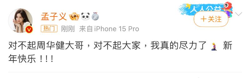 雖然不少網友覺得很可愛,但也有很多網友認為她毀了周華傑老師的舞台,因此在爆了熱搜榜之後,孟子義第一時間發文向周華健道歉,表示自己真的…盡力了!