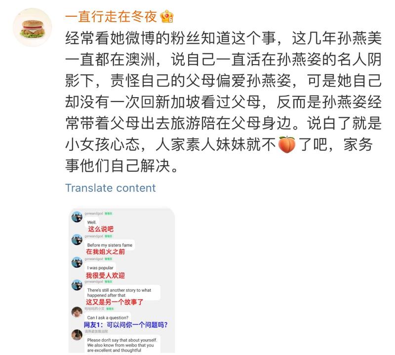 有粉絲總結,表示孫燕美這幾年一直在澳洲,說自己活在孫燕姿的名人陰影下,責怪父母偏愛姐姐,但自己卻沒有回過新加坡看過父母👇