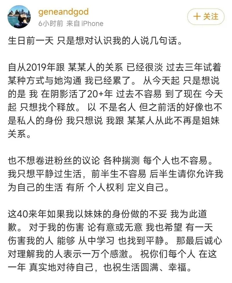但是,其妹妹孫燕美在5號這天,發長文和孫燕姿斷絕姐妹關係,文中提到:「我只想說,我跟某某人從此不再是姐妹關係。」並表示自己活在陰影下20多年,現在只想找個釋放!