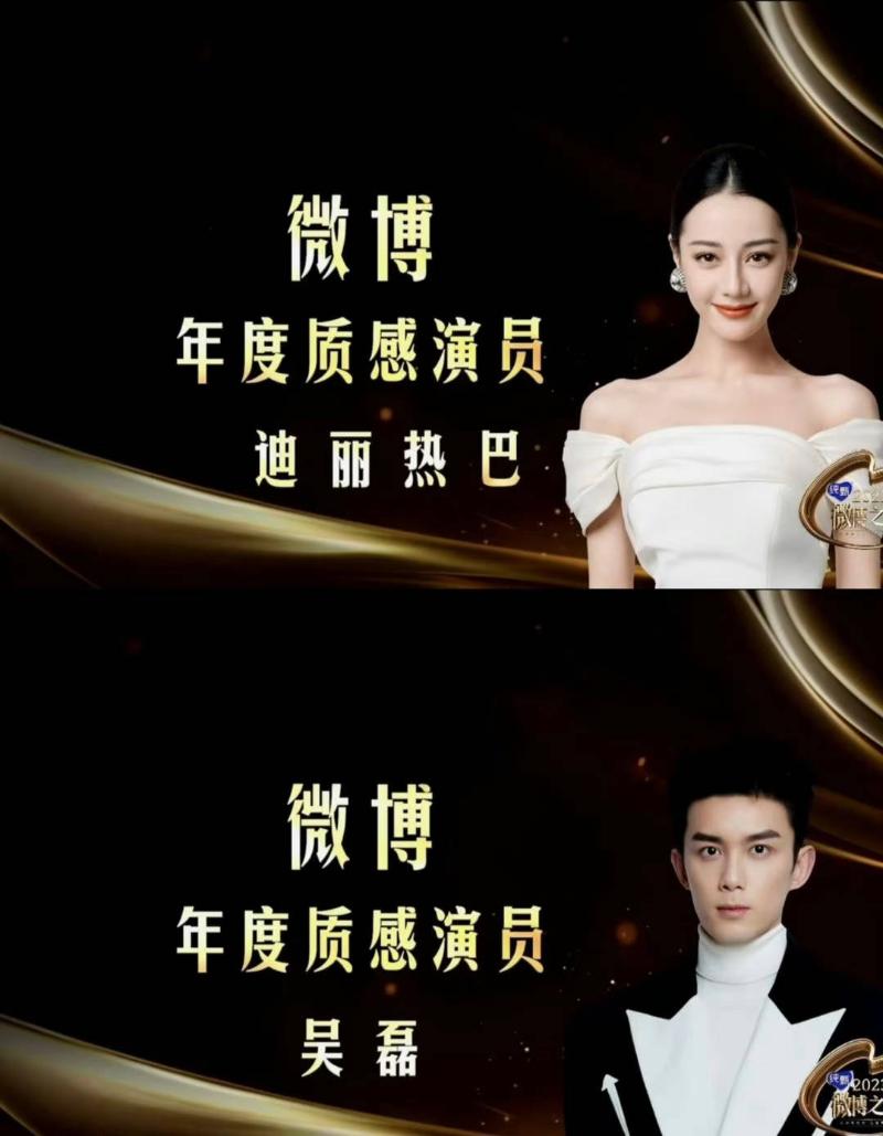 而在13號晚上的「微博之夜」,迪麗熱巴和吳磊連同白敬亭和井柏然,一起獲得了“微博年度質感演員”榮譽!