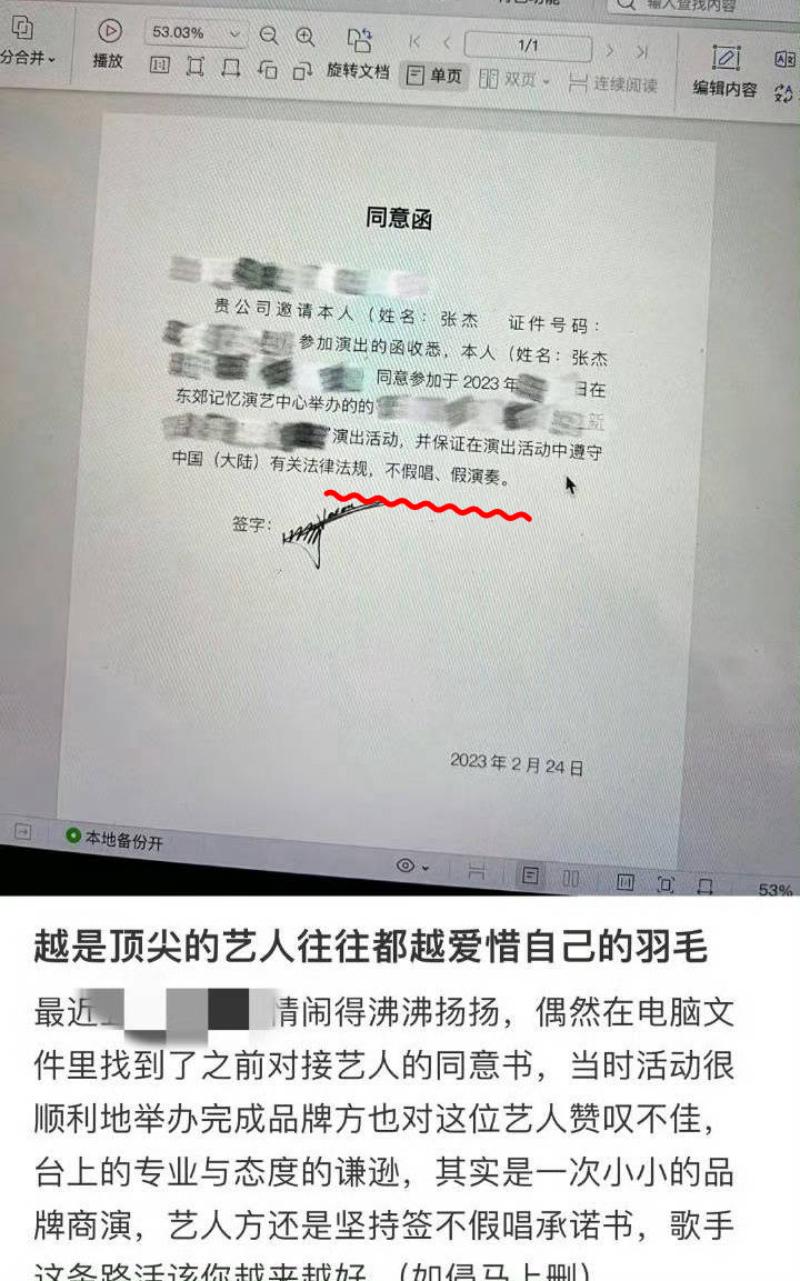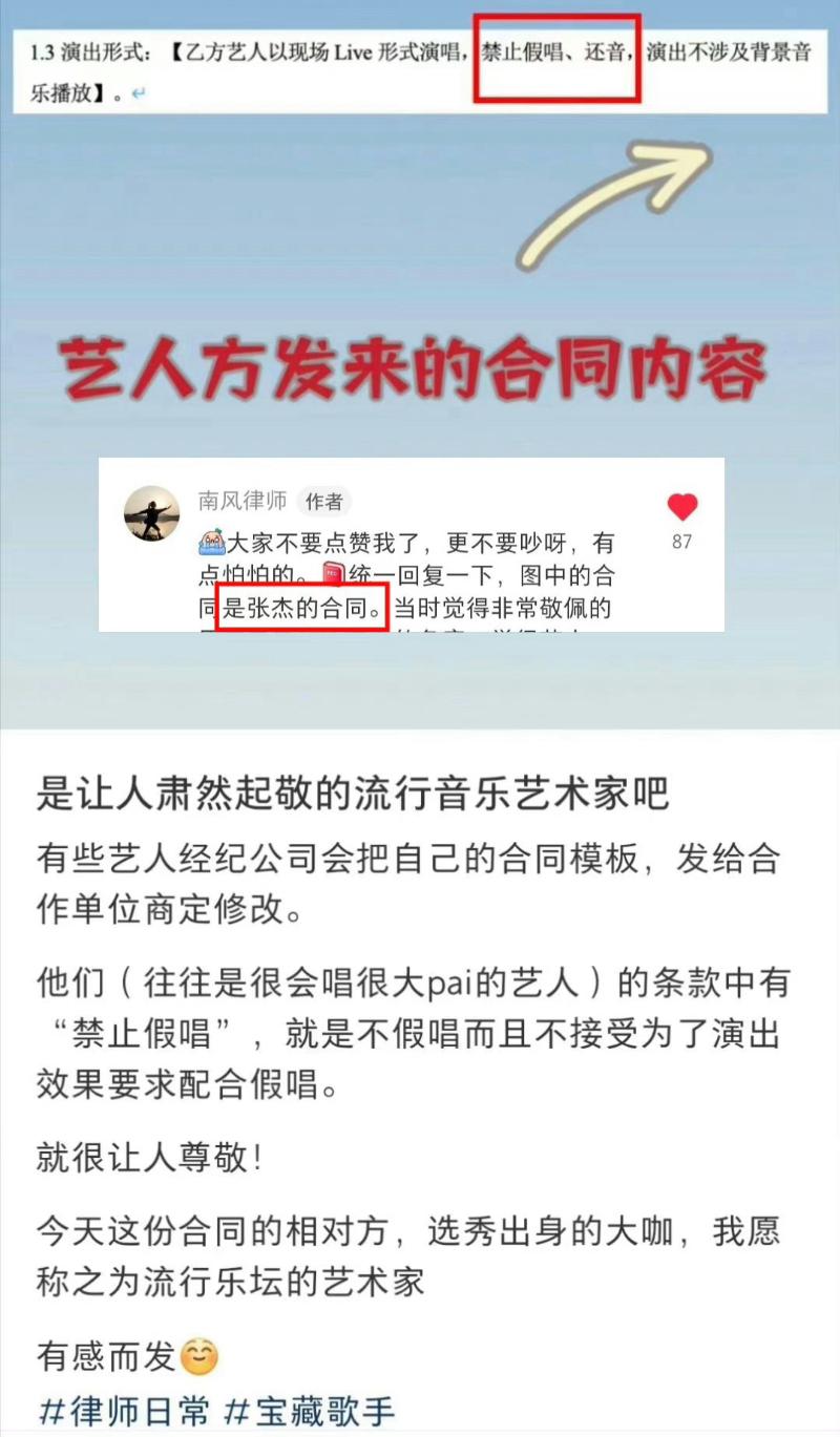 而粉絲也曬出了曾有律師曬出,張杰之前出席晚會的合約內容,當中提到了「禁止假唱、還音」👇