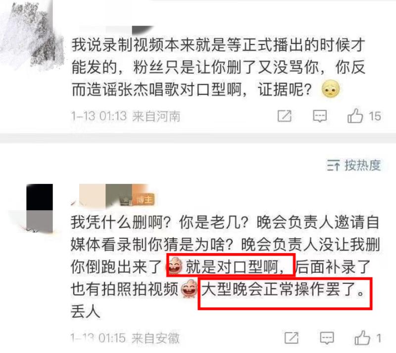 粉絲在評論區反問博主為什麼造謠張杰「唱歌對口型」?該博主直懟:「就是對口型啊」、「大型晚會正常操作罷了」