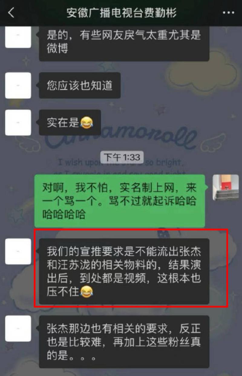 該博主更曬出和安徽電視台工作人員的對話截圖,當中提到不能流出張杰和汪蘇瀧的相關物料,這也間接證明了該博主的確出現在現場!