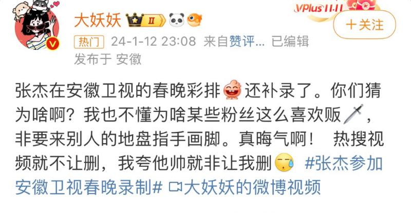 這番話立刻引起爭議,隨後該博主繼續發帖暗喻,反問粉絲:「張杰在安徽衛視的春晚,還補錄了,為啥啊?」