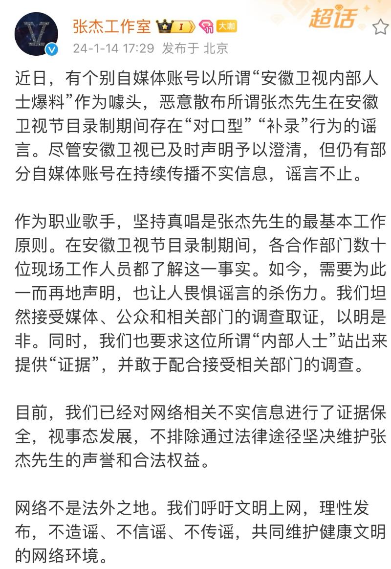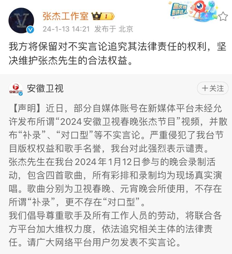 安徽衛視也發聲明,表示張杰錄製的四首歌曲,包括綵排和錄製都是現場真實演唱,並沒有「補錄」和「對口型」,張杰工作室隨後轉發,表示保留法律追究責任。