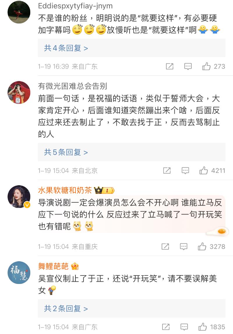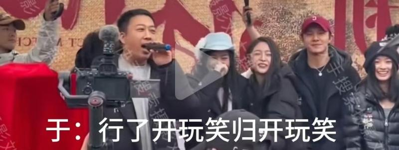 沒錯,在于正說出這麼不得體的話引起熱議之後,狗仔放出了完整片段,而劇中幾位主演的反應立刻引起關注!先來看看動圖~可以看見盧昱曉尷尬笑著遮嘴,男主王星越第一時間彎腰把頭擋住,而站在最前方的吳宣儀,整個人揮拳舉手跳起來,還連拍了于正好幾下!