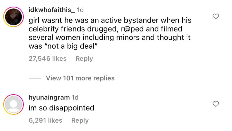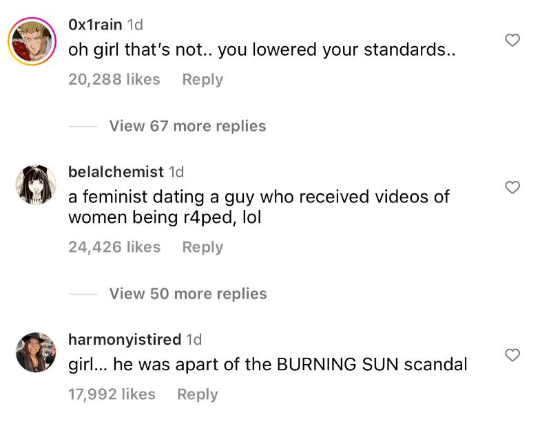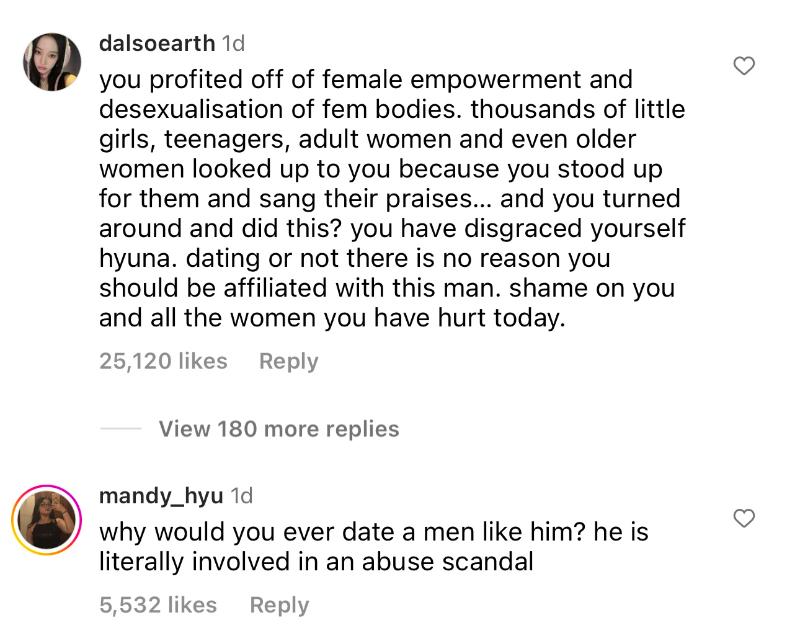 另外,在泫雅的官宣貼文下,也可以看見熱評都是對這段戀情的失望,認為泫雅是女權代表,卻和傷害了女性權利的共犯戀愛???