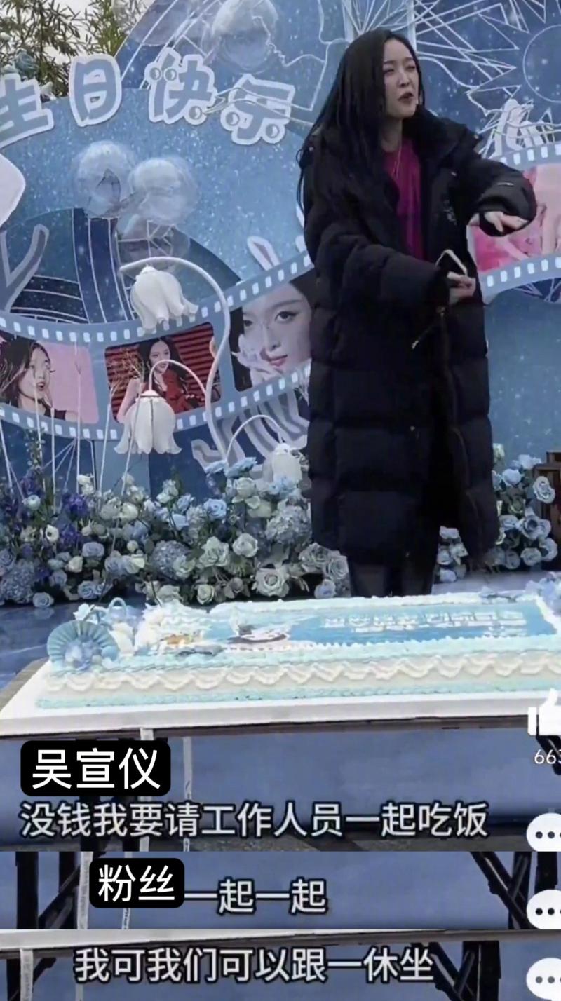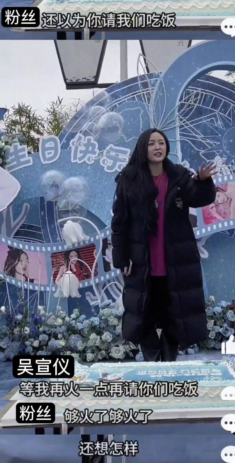 到底怎麼一回事?原來有媒體放出了吳宣儀在開機式上和粉絲的對話,視頻中粉絲說:「還以為你要請我們吃飯」,吳宣儀表示:「等我再紅一點請你們吃飯,現在沒錢」,粉絲回應表示已經很紅了👇