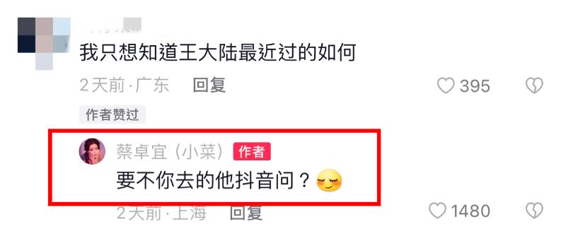最剛的是,對於在評論區詢問王大陸近況的惡意留言,蔡卓宜直接反懟:「要不你去他的抖音問?」