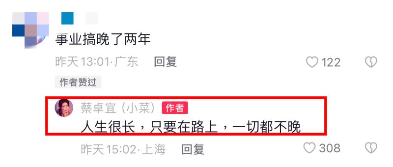 對於網友留言表示事業搞慢了兩年,蔡卓宜也高情商回應:「人生很長,只要在路上,一切都不晚。」