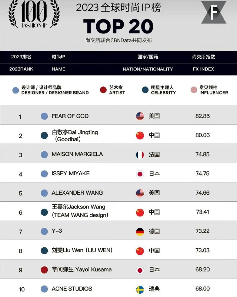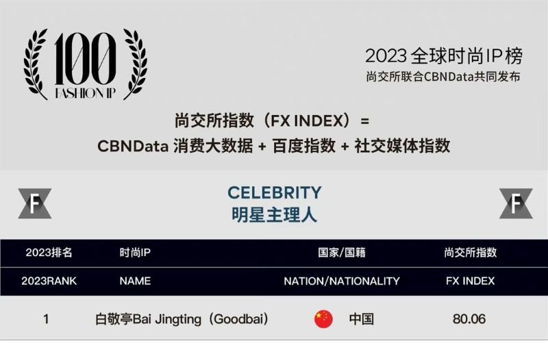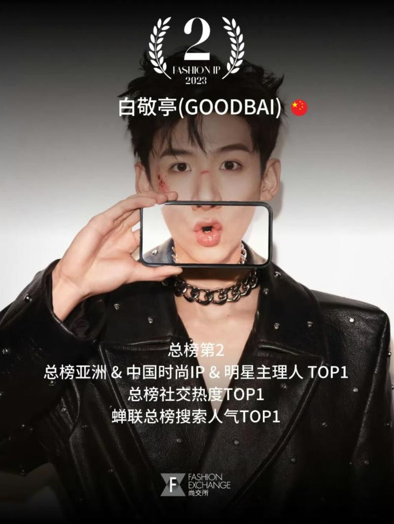 另外,今年已經第五年發佈的全球時尚IP榜《Fashion IP 100》,從消費影響力、搜索引擎熱度、社交媒體人氣三個維度,對全球範圍內超過400個時尚IP進行評估,評選出2023年度在中國市場綜合表現出色的100個時尚IP。而GoodBai在「明星主理人」這塊,被評選為第一名!